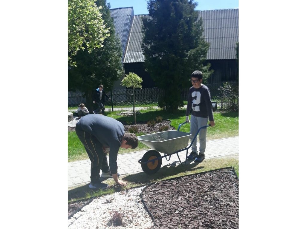 Uczniowie wykonujący prace pielęgnacyjne.